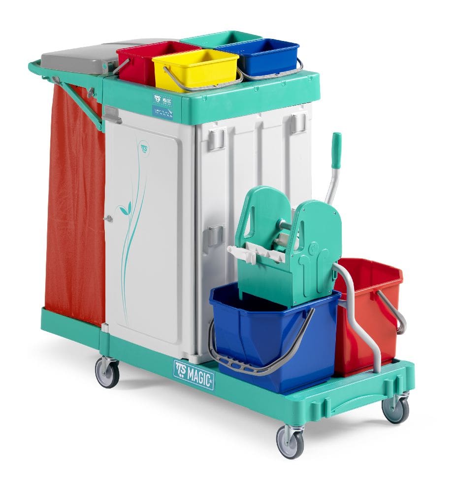 Chariot à 3 compartiments : 01 support sac de 120 L pliable, un espace de stockage fermé avec tiroir et lavage avec presse à 02 seaux. Il comprend 04 seaux de 04 litres de différentes couleurs, un bac de 22 litres et 02 seaux de 15 litres avec presse professionnelle.