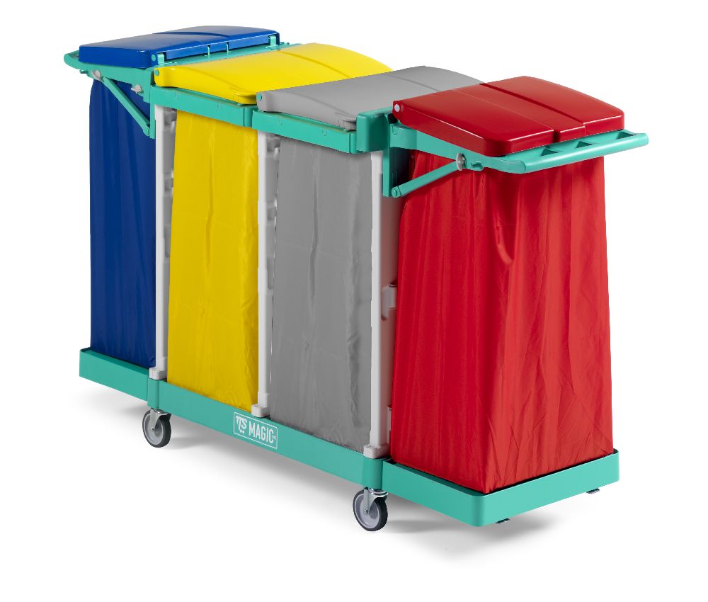 Chariot  avec quatre porte-sacs (2 de 120 L et 2 de 150 L) pour le ramassage et tri des déchets, idéal pour tous les secteurs d’activité.