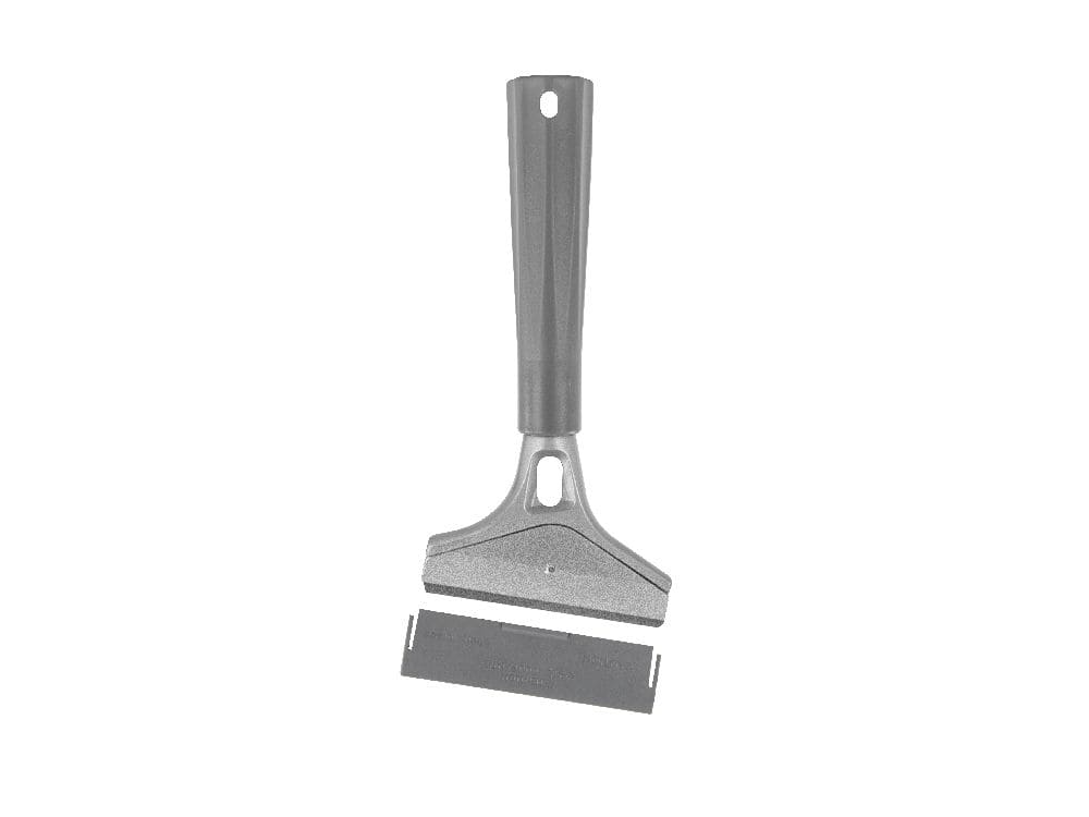 Grattoir en métal avec protège-lame et poignée pour compléter le nettoyage et éliminer la saleté incrustée.