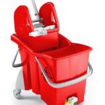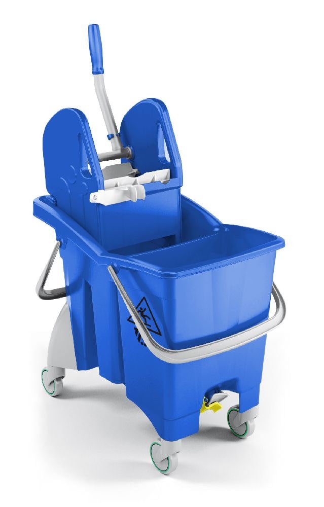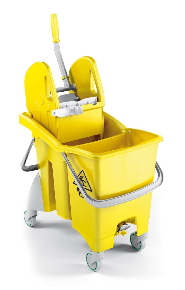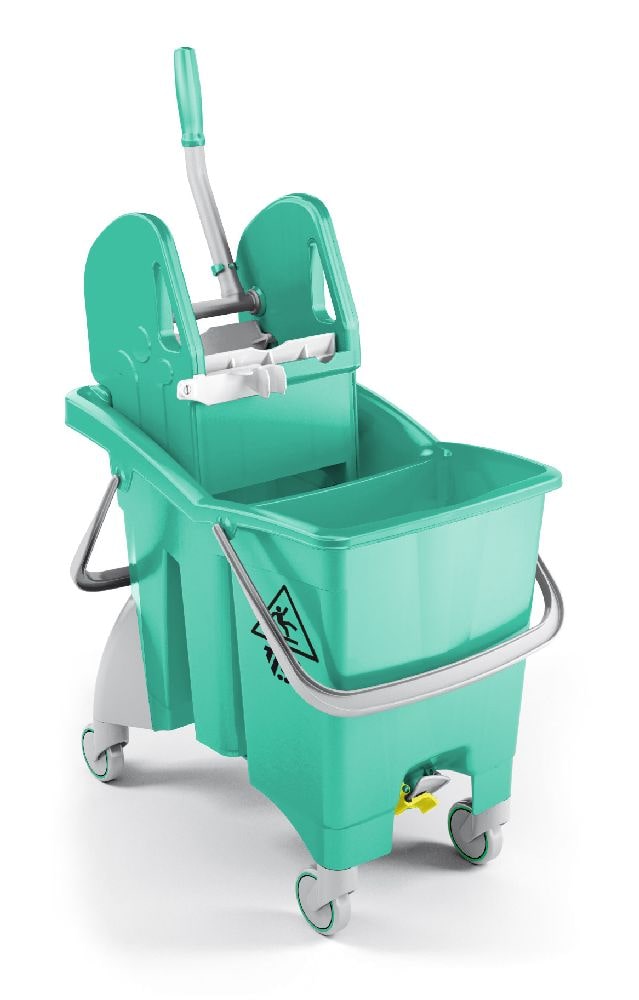Seau à deux compartiments avec double vidange, une presse à mâchoires Tec et roues de 80 mm de diamètre.